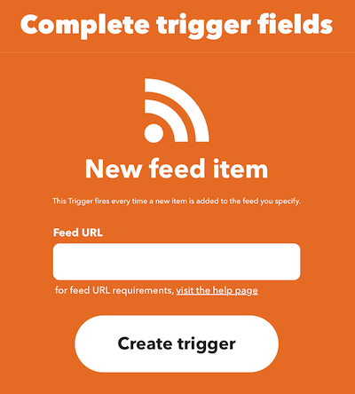 ・「Feed URL」に、参照するサイトのRSS feedのURLを入力して、「Create trigger」を押す。