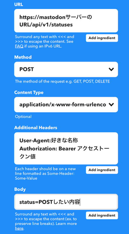 ・URL:Mastodonサーバー側の窓口になるURLを入力。自分は、「mstdn.jp」のユーザなので、「https://mstdn.jp/api/v1/statuses」と入力。