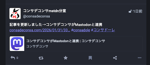 自分が管理運営している「コンサデコンサ」の投稿記事のRSSを参照し、Mastodonへお知らせを(IFTTTにより)自動でPOSTしたい。昔チャレンジした際はどうしてもうまくいかず、あきらめていた。最近になって対話型AIの回答ではできることになっていたので、あーでもない、こーでもないとかなり苦労しながらもなんとかうまくいった。