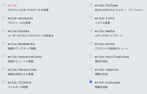 ・アクセス権:「write:statuses」だけをチェック。その他のチェックは全てはずす。POST以外のことをするのであれば、その部分の機能をチェックする必要あり。今回は、RSS側からMastodonへPOSTするのが目的なので、「write:statuses」の部分だけをチェック。