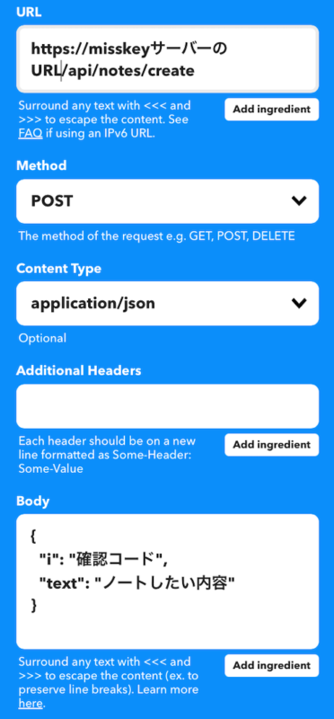 ・URL:Misskeyサーバー側の窓口になるURLを入力。自分は、「misskey.io」のユーザなので、「https://misskey.io/api/notes/create」と入力。